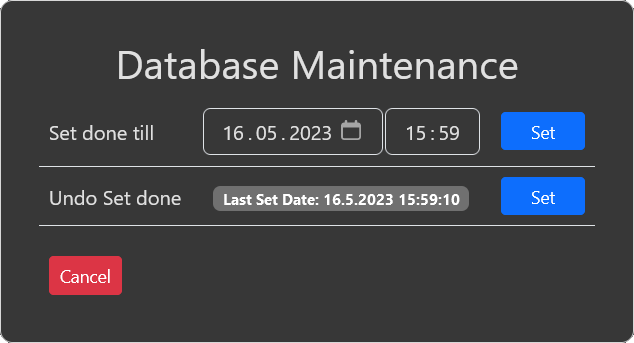 Database management allows to set support received up to a defined timestamp as done. By default the date value is set to the oldest support not marked as done,