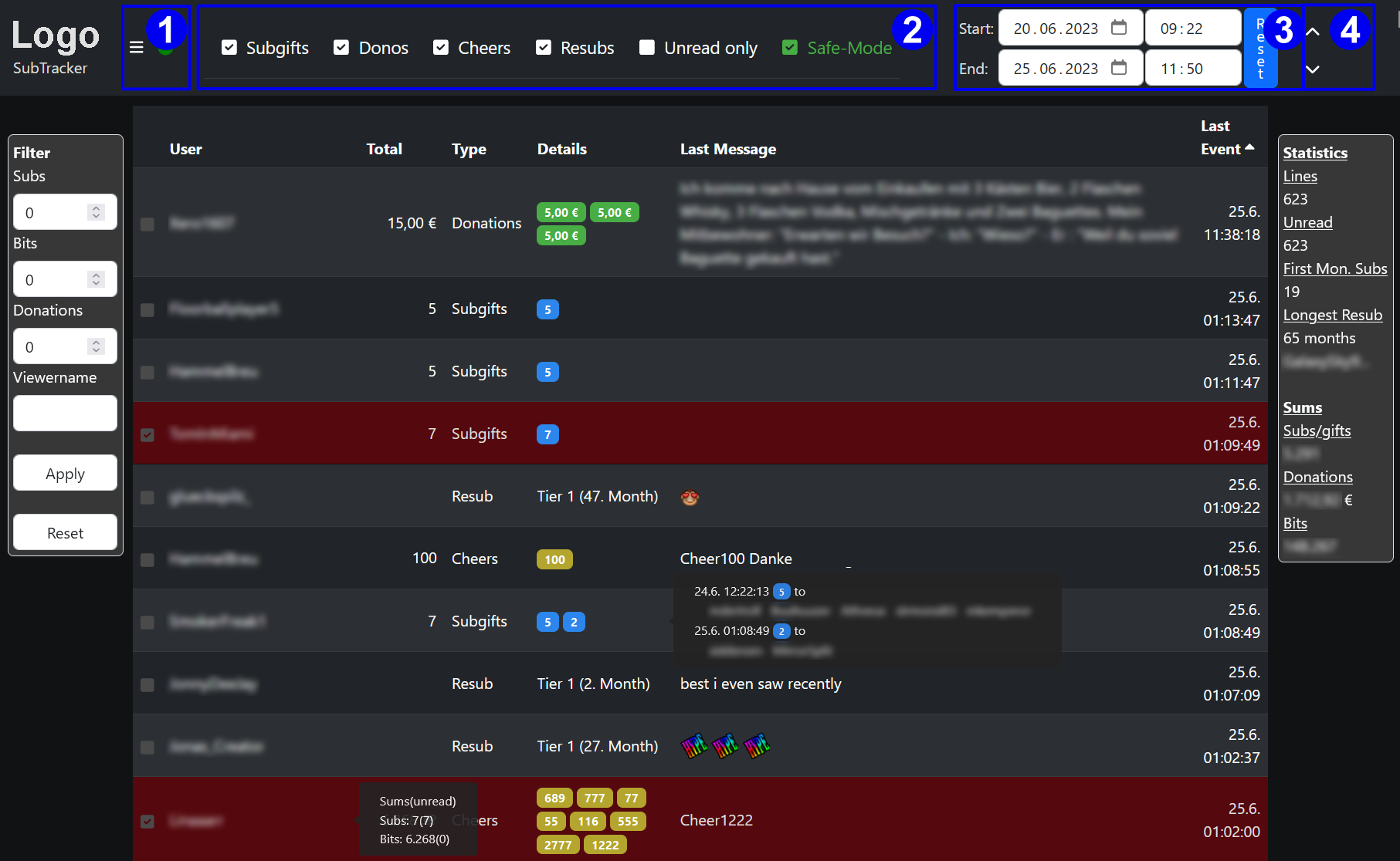 Here you can define the start and end date/time for the lines shown in the table. When opening the subtracker page the starttime is initialized with timestamp of the oldes unread entry in the database. The enddate is empty by default, so every line newer as the starttime is shown and new support coming in is added to the table dynamically.