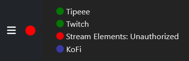 This mostly happens with Streamelements as they often invalidate the used JSON Web Token (JWT). Users with administration permission will see a menu item in the Main Menu to set a new Streamelements token. - Blue: The provider is configured, but there is no method to detect if the connection is successful. You are on your own, sorry.