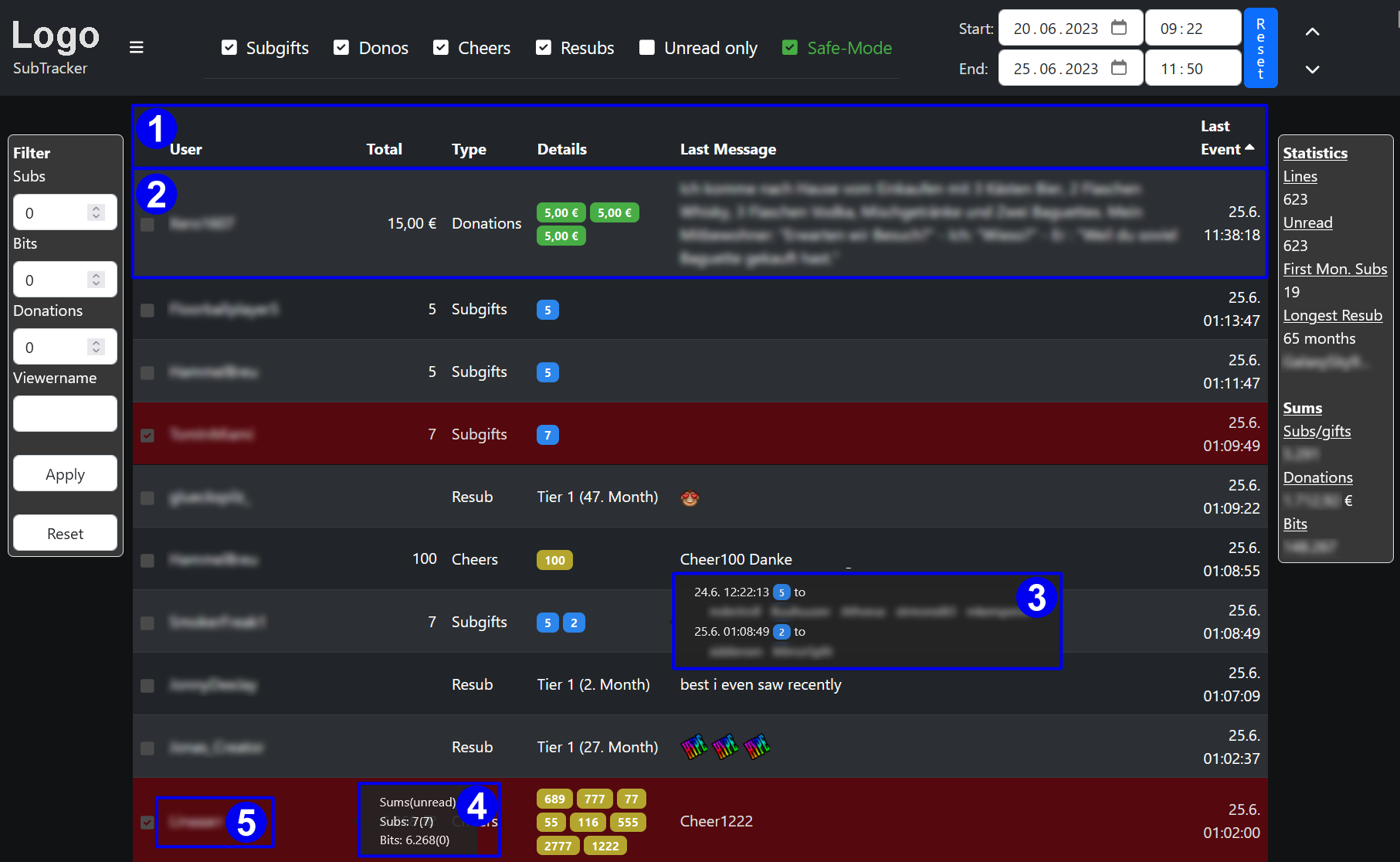 - Type: The type of support is shown in this column. Currently this can be cheers, donations, resubs and subgifts