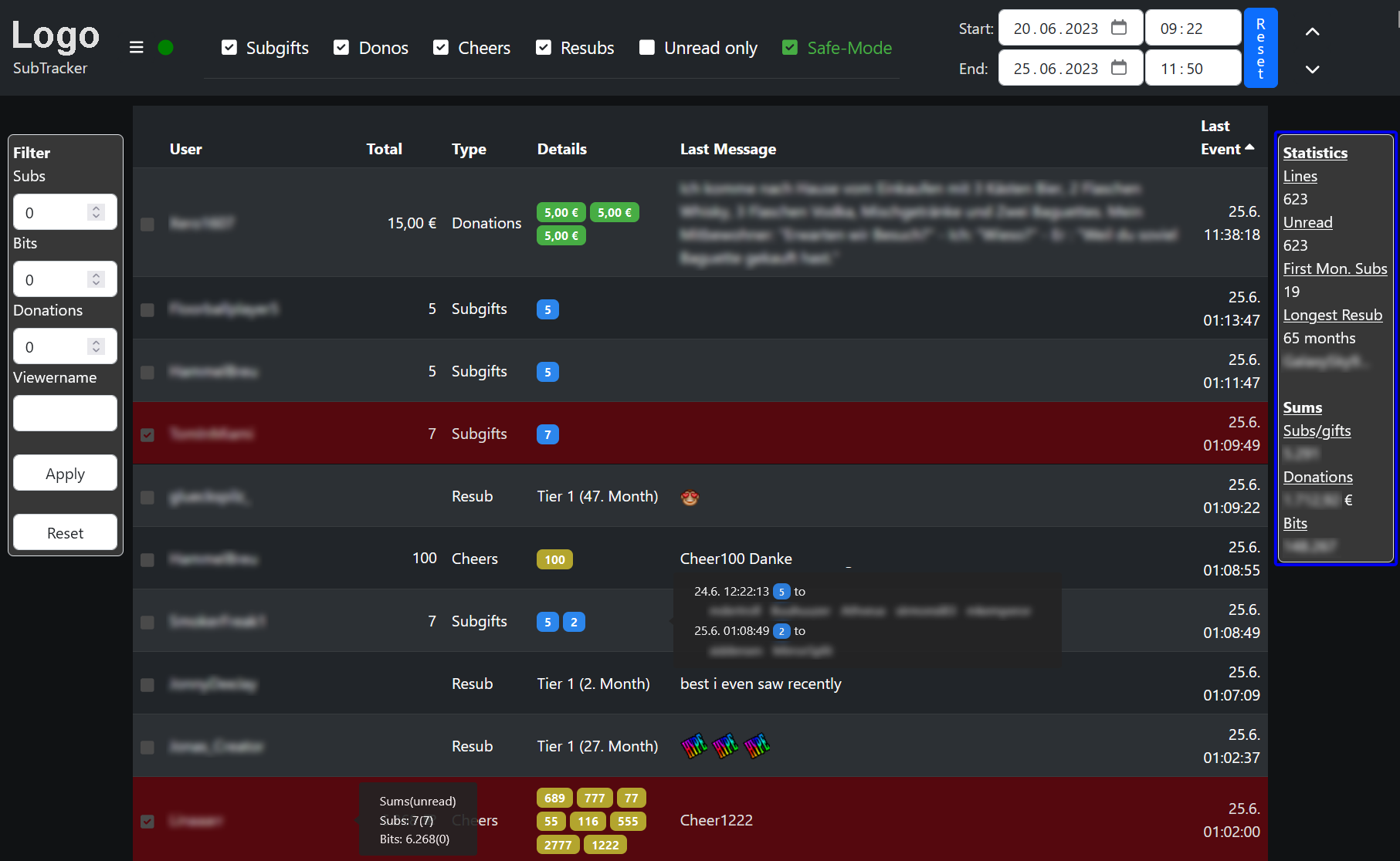 - Subs/gifts: Overall sum of subgifts/resubs in table
